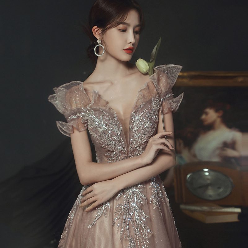 2024 new pink wedding evening dress, with suspender tail style suitable for brides to wear at their wedding.
