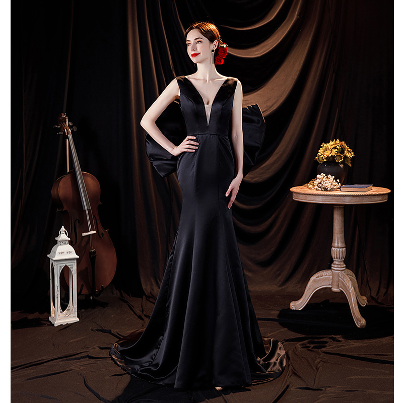 2024 black satin socialite floor-length evening gown, simple and fashionable.